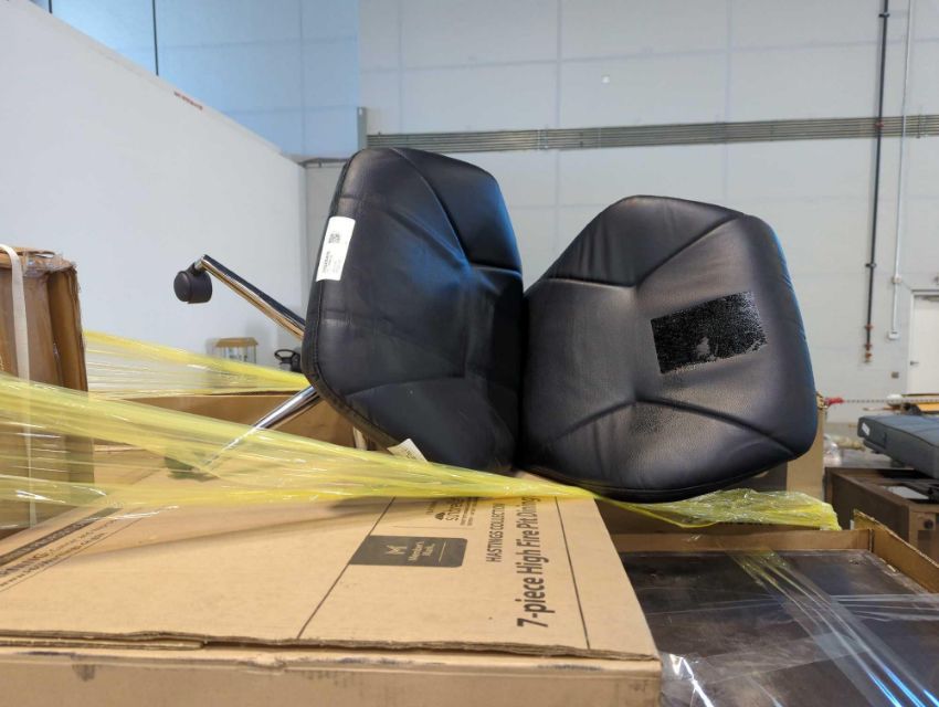 Keter XXL wood deck box, offic chair, Hastings 7pc high fire pit dining set (has 3 of 3 boxes), and more