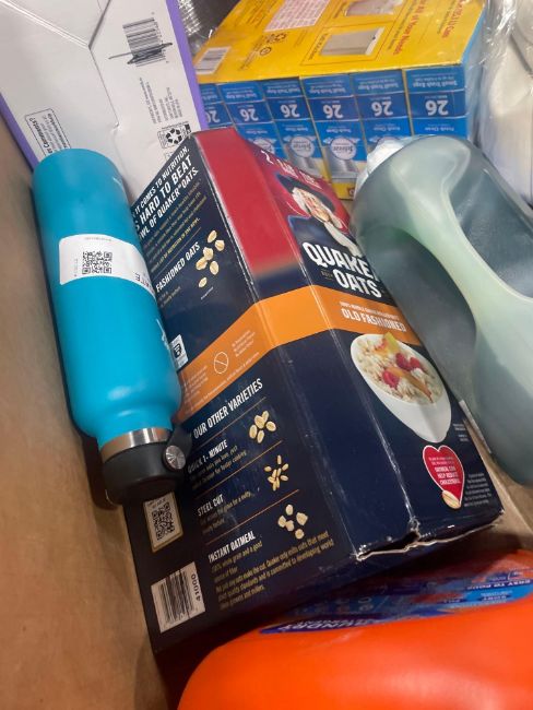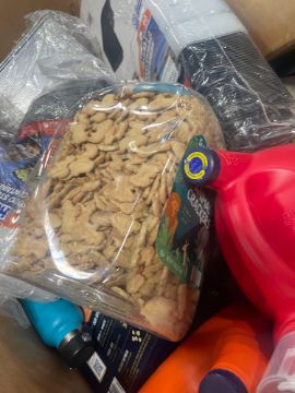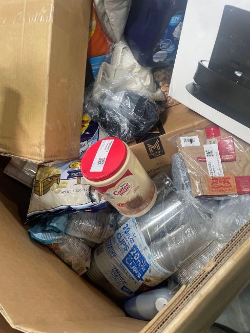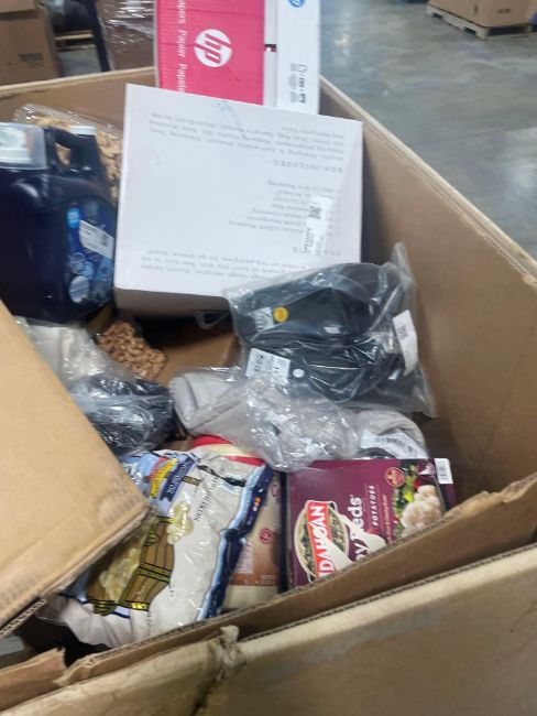 Big box store in box: Dustin bobsweep, detergent, cashews, potatotes, coffee mate, popcorn, cups, foil pains, pillow, filter, bags and more
