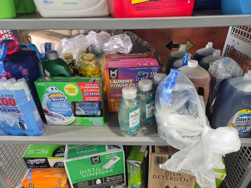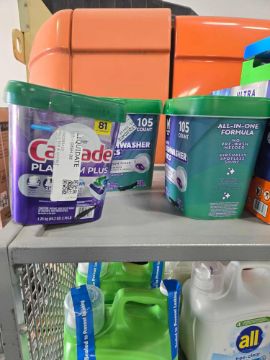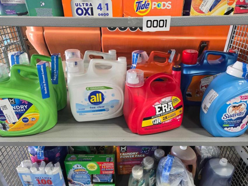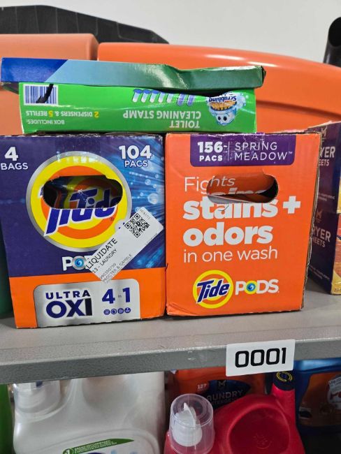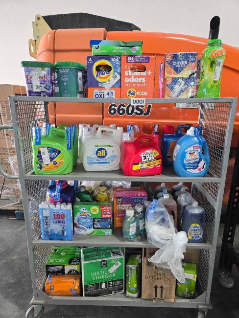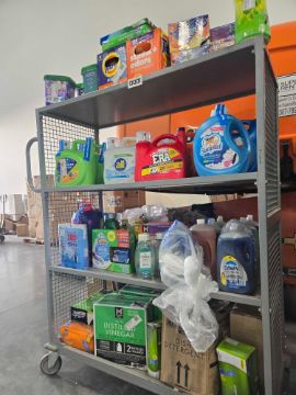 Rolling rack of Cleaning supplies: Tide pods, Dryer sheets, Gain, Cascade pods, Laundry, All, Era, Suavitul, Lysol, down, dawn, Dish detergent, Exam gloves, Scrubbin bubbles, pine sol and more